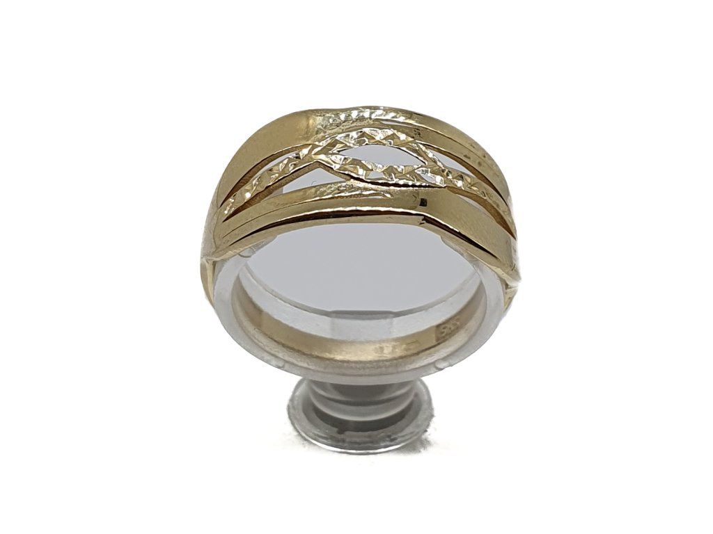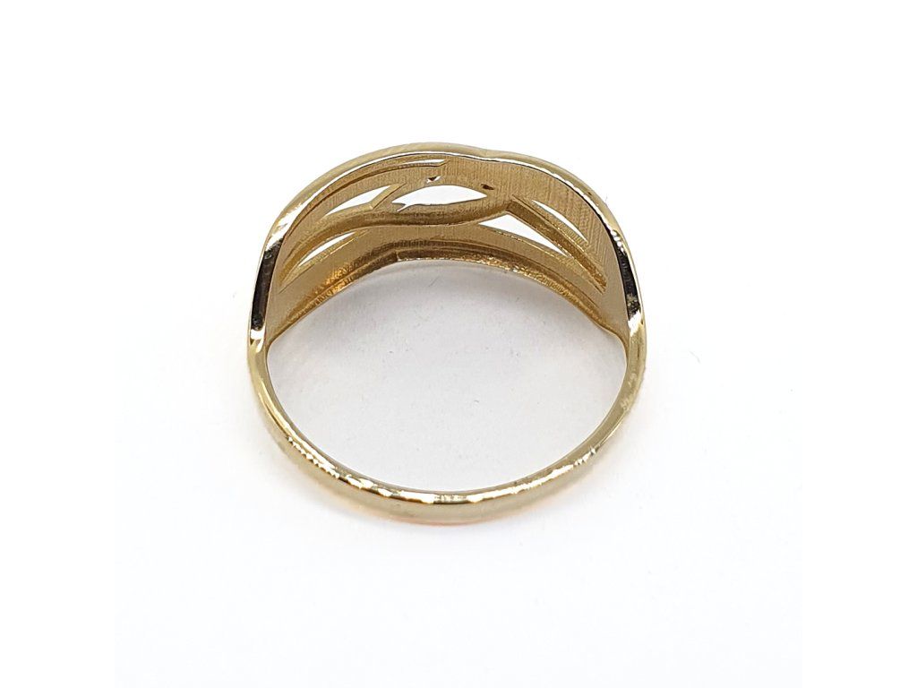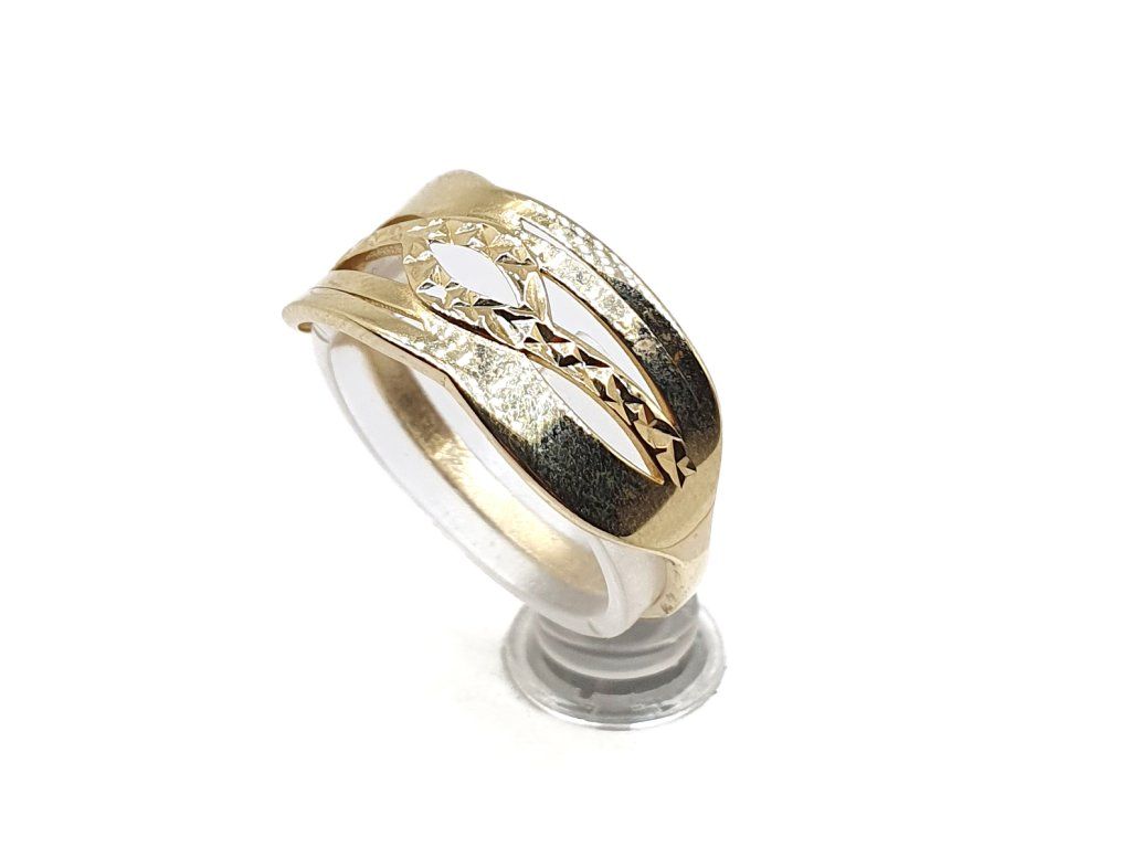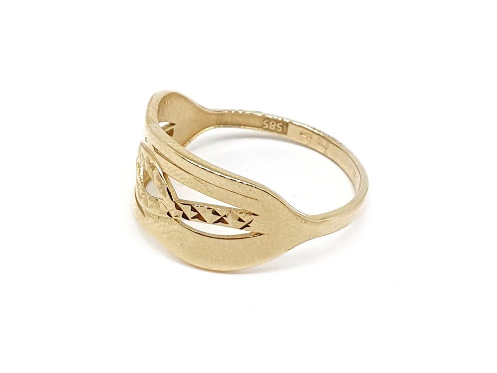 Elegantní dámský prsten vyrobený ze 14kt žlutého zlata s originálním prořezávaným vzorem. Moderní design kombinuje lesklé linie s jemným gravírováním, které šperku dodává jedinečný třpyt bez použití kamenů.