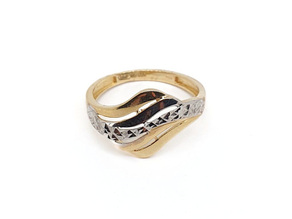Elegantní prsten ze 14kt žlutého zlata ve velikosti 55. Šperk zaujme proplétanými liniemi a středovým pásem z bílého zlata s jemným gravírováním, které vytváří oslnivý odlesk. Kvalitní šperk o váze 1,75 g.
