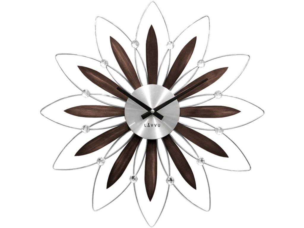 Designové hodiny LAVVU mají průměr 49 cm a jsou vyrobeny z vysoce kvalitního kovu s dýhovanými dřevěnými lístky ve tvaru květiny.