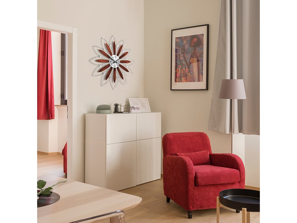 Designové hodiny LAVVU mají průměr 49 cm a jsou vyrobeny z vysoce kvalitního kovu s dýhovanými dřevěnými lístky ve tvaru květiny.