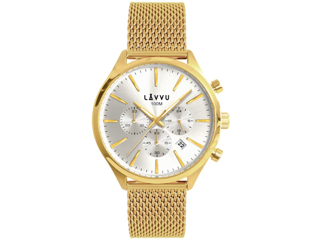 Odolné hodinky značky LAVVU s chronografem, vyrobené z hypoalergenní nerezové oceli. Nadstandardní vodotěsnost 100M, minerální tvrzené sklíčko, ukazatel data a stylový design z nich tvoří spolehlivý doplněk, který bude skvěle vypadat k formálnímu i volnočasovému oblečení. Vyměnitelný řemínek je možné zkrátit a přizpůsobit obvodu ruky.