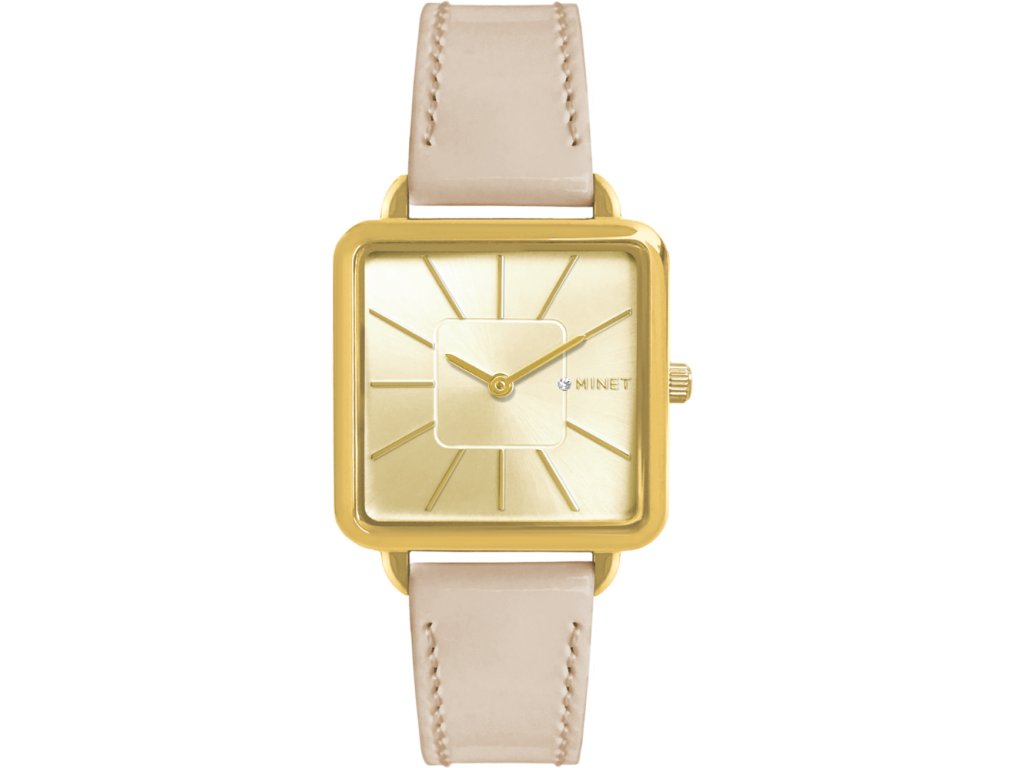 Elegantní hodinky české značky MINET se zlatým číselníkem a moderním lakovaným béžovým páskem. Vyměnitelný řemínek z hladké hovězí španělské kůže TopGrain, která je označována za nejkvalitnější a nejodolnější kůži na světě. Hodinky jsou vyrobeny z hypoalergenní nerezové oceli.