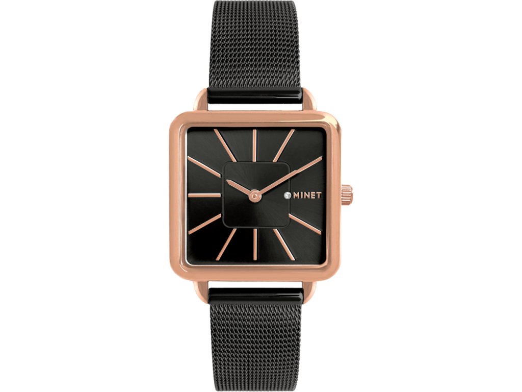 Elegantní hodinky české značky MINET s černým číselníkem a detaily v barvě růžového zlata. Moderní ocelový řemínek milánského typu se systémem Easy-click lze snadno vyměnit za jiný i bez použití hodinářského náčiní a snadným systémem zkracování ho přizpůsobit obvodu ruky. Hodinky jsou vyrobeny z hypoalergenní nerezové oceli.