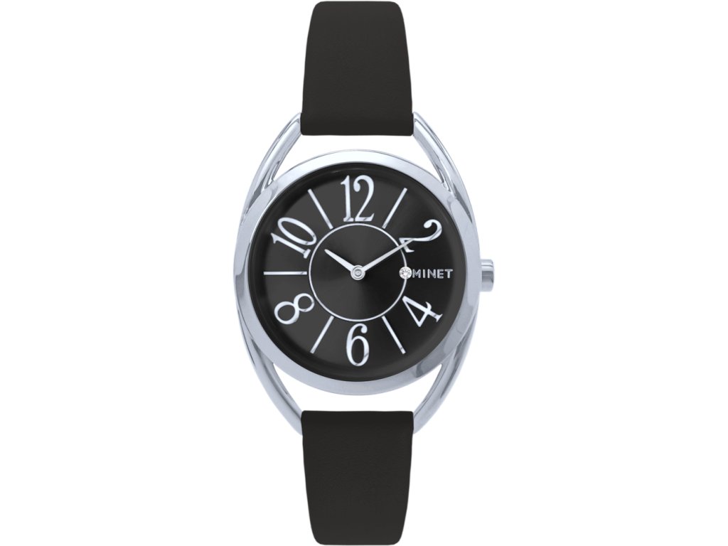 MINET Černo-stříbrné dámské hodinky s čísly ICON BLACK s černým koženým řemínkem