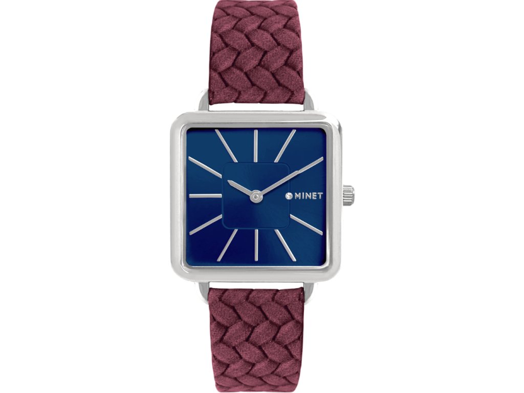 Elegantní hodinky české značky MINET s modrým číselníkem, stylovým propleteným vínovým řemínkem a detaily ve stříbrné barvě. Vyměnitelný řemínek z luxusní španělské kůže TopGrain, která je označována za nejkvalitnější a nejodolnější kůži na světě. Hodinky jsou vyrobeny z hypoalergenní nerezové oceli.