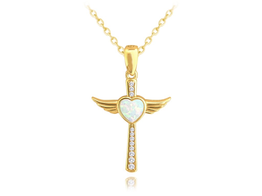 MINET Pozlacený stříbrný náhrdelník ANDĚLSKÝ KŘÍŽEK s bílým opálovým srdíčkem