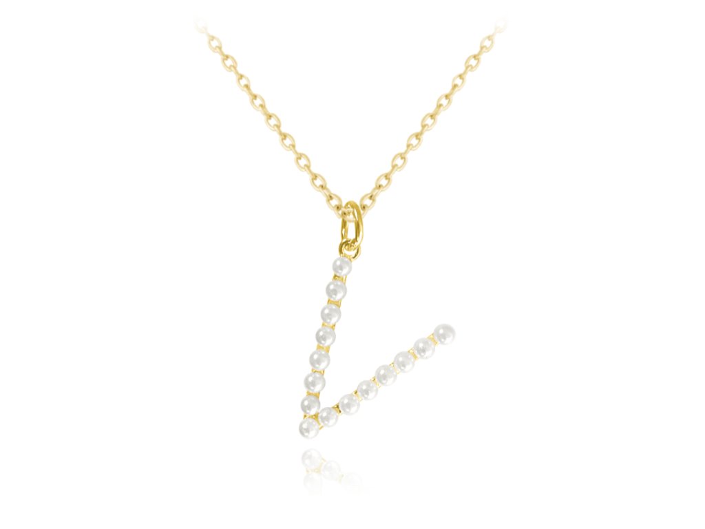MINET Pozlacený stříbrný náhrdelník písmeno "V" s perličkami