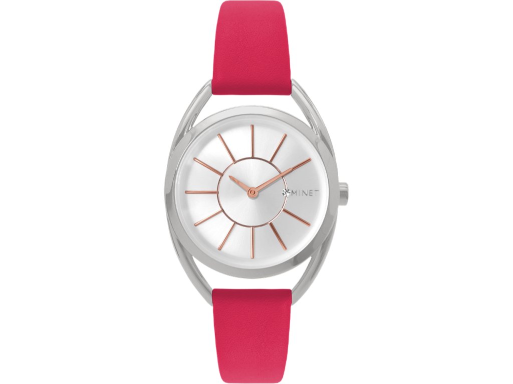 Elegantní hodinky české značky MINET se stříbrným číselníkem a moderním růžovým páskem. Vyměnitelný řemínek z jemné pravé kůže. Hodinky jsou vyrobeny z hypoalergenní nerezové oceli.
