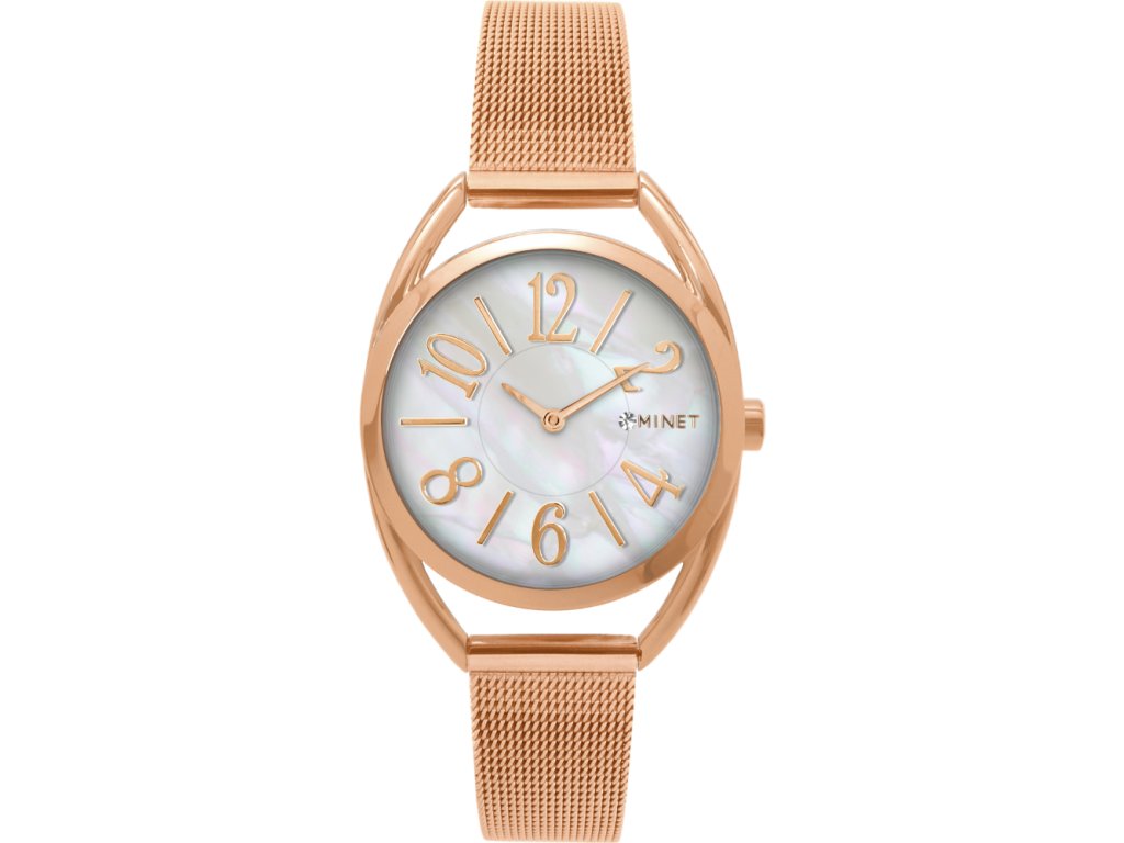 Elegantní hodinky české značky MINET s číselníkem z pravé perleti a moderním ocelovým řemínkem milánského typu v barvě růžového zlata. Vyměnitelný řemínek se snadným systémem zkracování se přizpůsobí obvodu ruky. Hodinky jsou vyrobeny z hypoalergenní nerezové oceli.