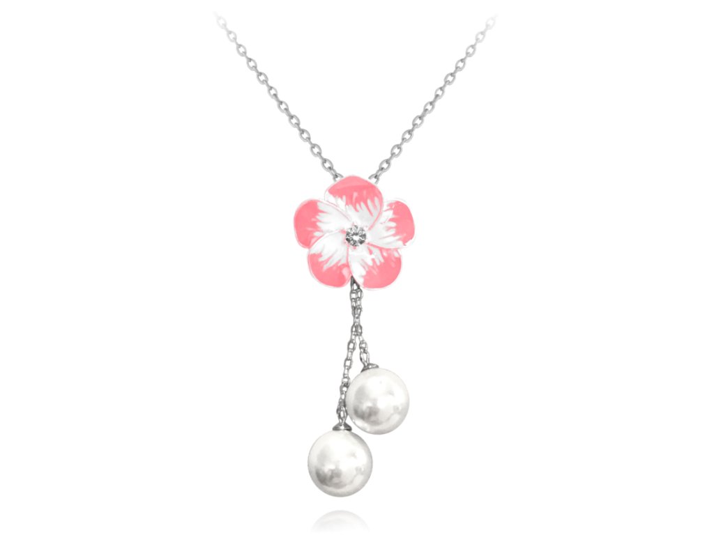MINET Růžový rozkvetlý stříbrný náhrdelník FLOWERS se zirkonem a perličkami