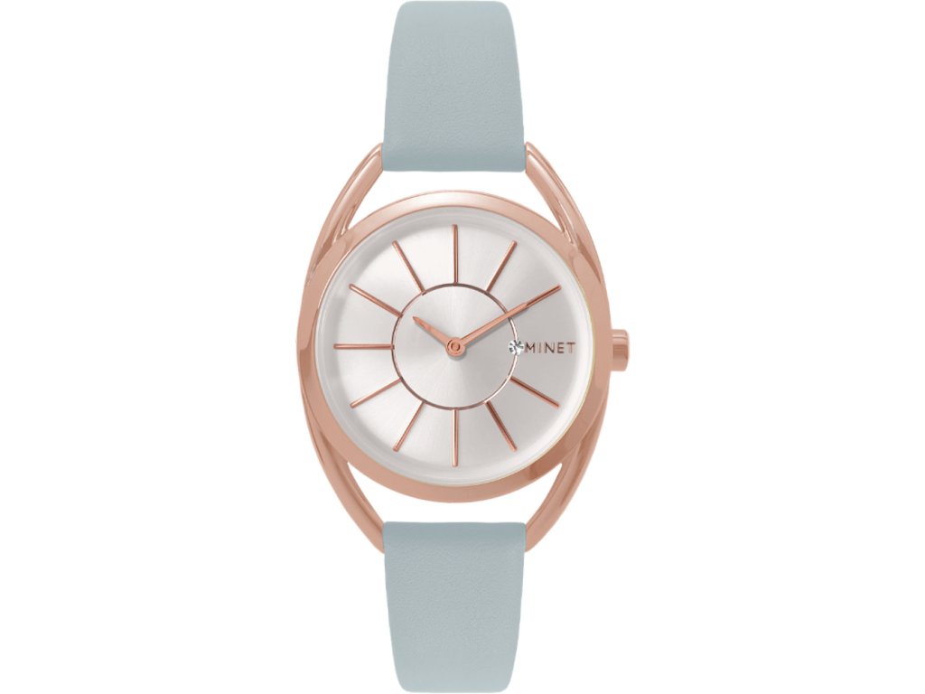 Elegantní hodinky české značky MINET se stříbrným číselníkem, moderním šedým páskem a detaily v barvě růžového zlata. Vyměnitelný řemínek z hladké a jemné kůže. Hodinky jsou vyrobeny z hypoalergenní nerezové oceli.