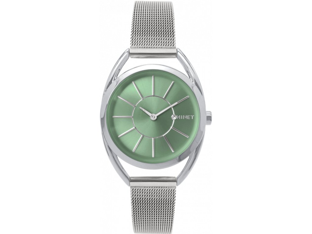 Elegantní hodinky české značky MINET se zeleným číselníkem a moderním ocelovým řemínkem milánského typu ve stříbrné barvě. Vyměnitelný řemínek se snadným systémem zkracování se přizpůsobí obvodu ruky. Hodinky jsou vyrobeny z hypoalergenní nerezové oceli.