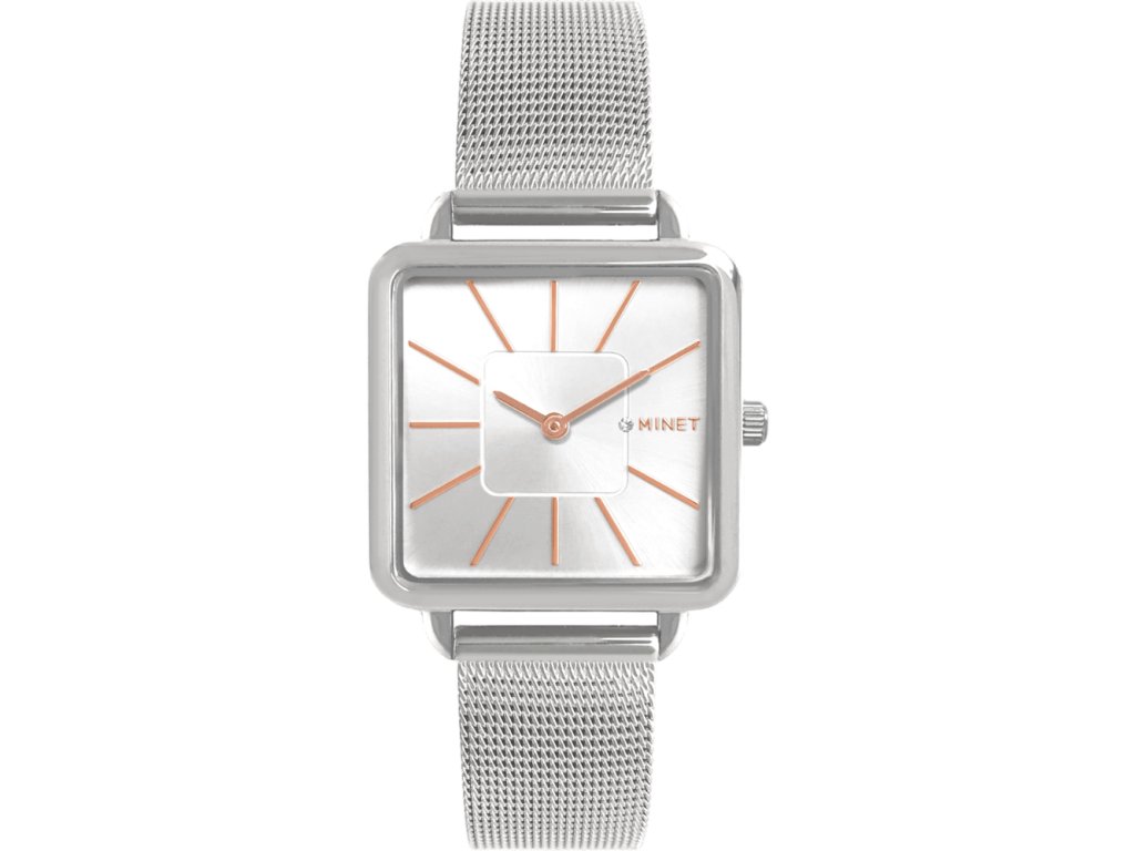 Elegantní hodinky české značky MINET se stříbrným číselníkem a detaily v barvě růžového zlata. Moderní ocelový řemínek milánského typu se systémem Easy-click lze snadno vyměnit za jiný i bez použití hodinářského náčiní a snadným systémem zkracování ho přizpůsobit obvodu ruky. Hodinky jsou vyrobeny z hypoalergenní nerezové oceli.