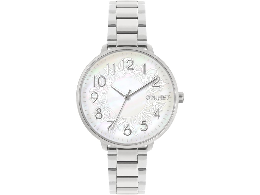 Elegantní hodinky české značky MINET s perleťovým ciferníkem a moderním ocelovým páskem. Vyměnitelný řemínek lze zkrátit a přizpůsobit tak délku obvodu ruky. Hodinky jsou vyrobeny z hypoalergenní nerezové oceli.