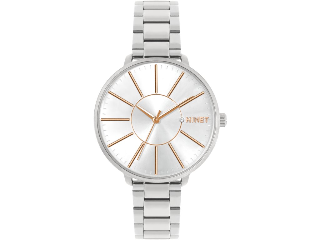 Elegantní hodinky české značky MINET se stříbrným číselníkem a moderním ocelovým řemínkem. Vyměnitelný řemínek je možné zkrátit a přizpůsobit jeho délku obvodu ruky. Hodinky jsou vyrobeny z hypoalergenní nerezové oceli.