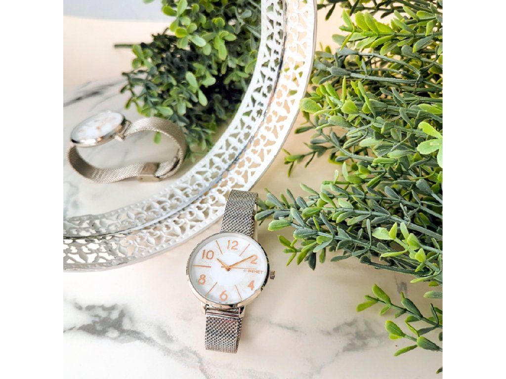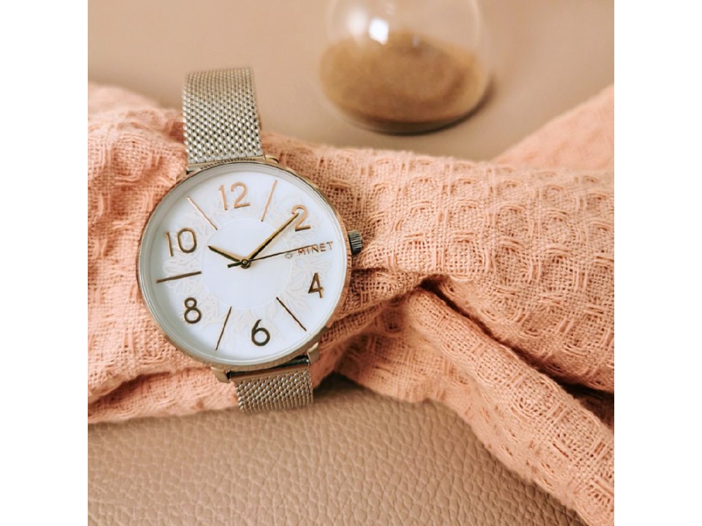 Elegantní hodinky české značky MINET s bílým perleťovým číselníkem a moderním ocelovým řemínkem milánského typu. Vyměnitelný řemínek se snadným systémem zkracování se přizpůsobí obvodu ruky. Hodinky jsou vyrobeny z hypoalergenní nerezové oceli.