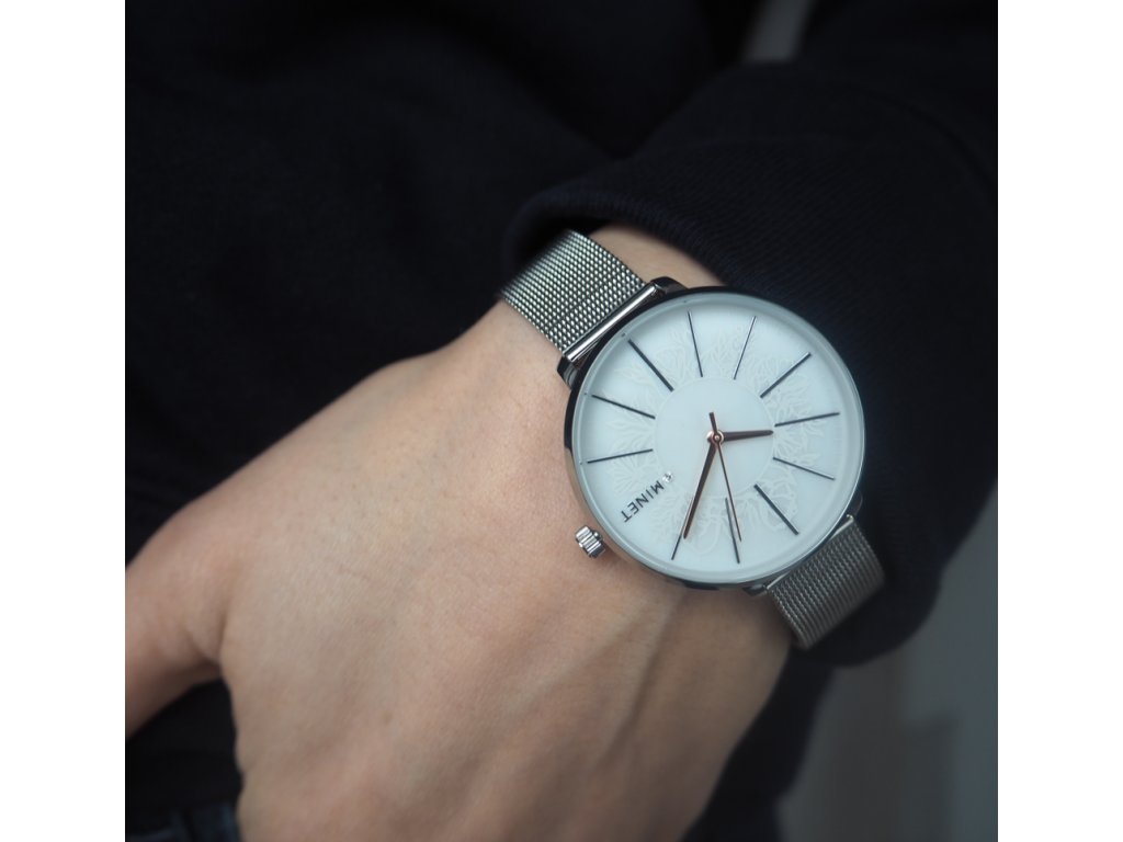 Elegantní hodinky české značky MINET s bílým perleťovým číselníkem a moderním ocelovým řemínkem milánského typu. Vyměnitelný řemínek se snadným systémem zkracování se přizpůsobí obvodu ruky. Hodinky jsou vyrobeny z hypoalergenní nerezové oceli.