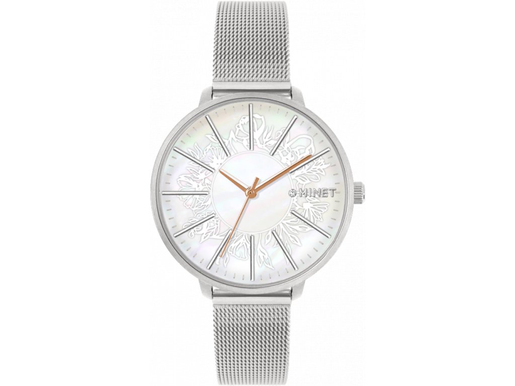 MINET Stříbrné dámské hodinky PRAGUE Silver Flower Mesh