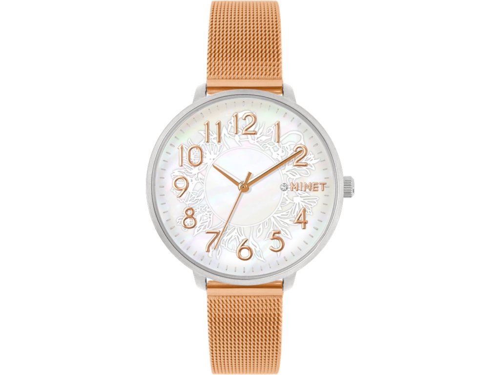 Elegantní hodinky české značky MINET s bílým perleťovým číselníkem a moderním ocelovým řemínkem milánského typu v barvě růžového zlata. Vyměnitelný řemínek se snadným systémem zkracování se přizpůsobí obvodu ruky. Hodinky jsou vyrobeny z hypoalergenní nerezové oceli.