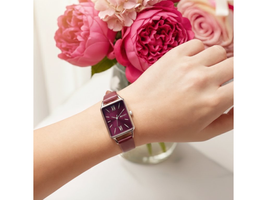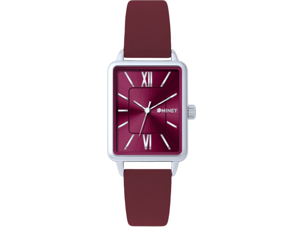 MINET Stříbrno-vínové dámské hodinky SIENA s vínovým koženým řemínkem