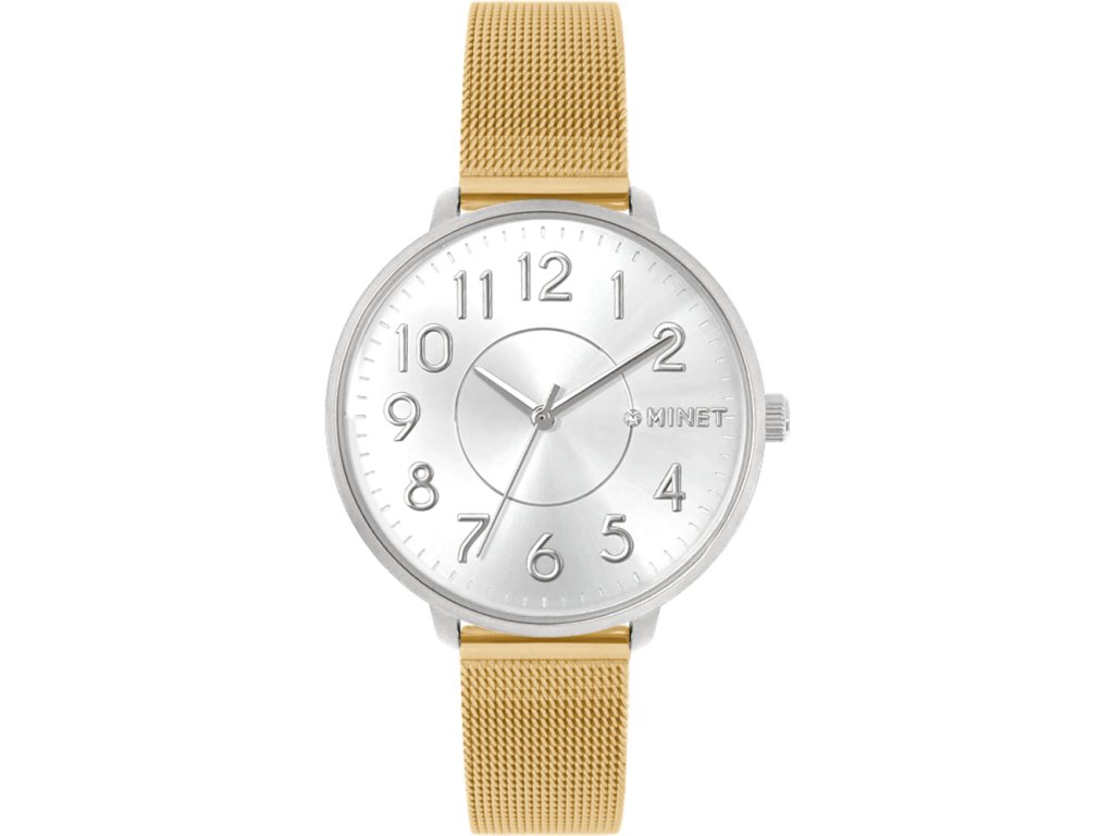 Elegantní hodinky české značky MINET se stříbrným perleťovým číselníkem a moderním ocelovým řemínkem milánského typu zlaté barvy. Vyměnitelný řemínek se snadným systémem zkracování se přizpůsobí obvodu ruky. Hodinky jsou vyrobeny z hypoalergenní nerezové oceli.