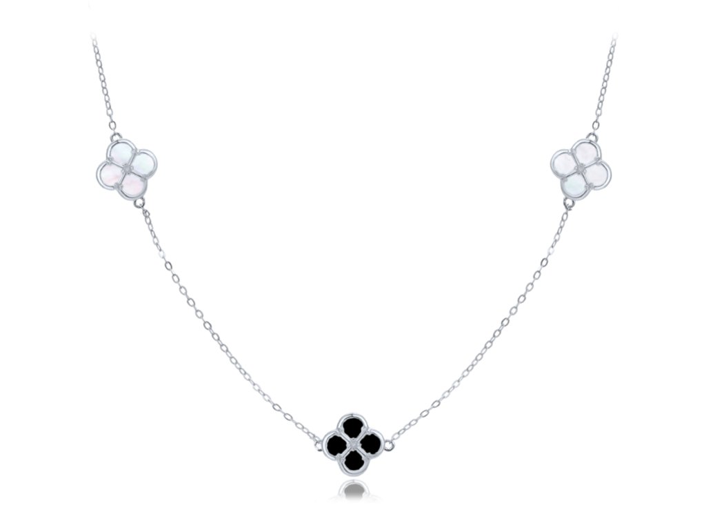 MINET Stříbrný náhrdelník čtyřlístky s bílou a černou perletí
