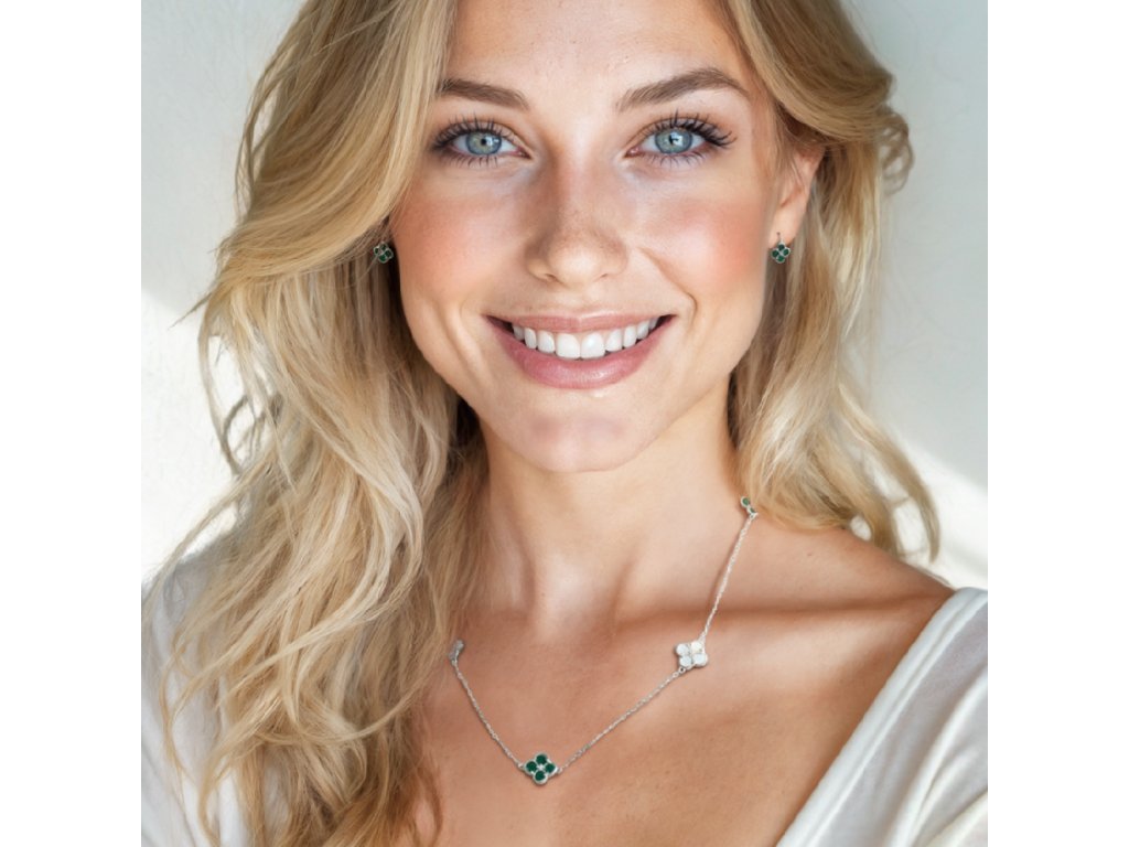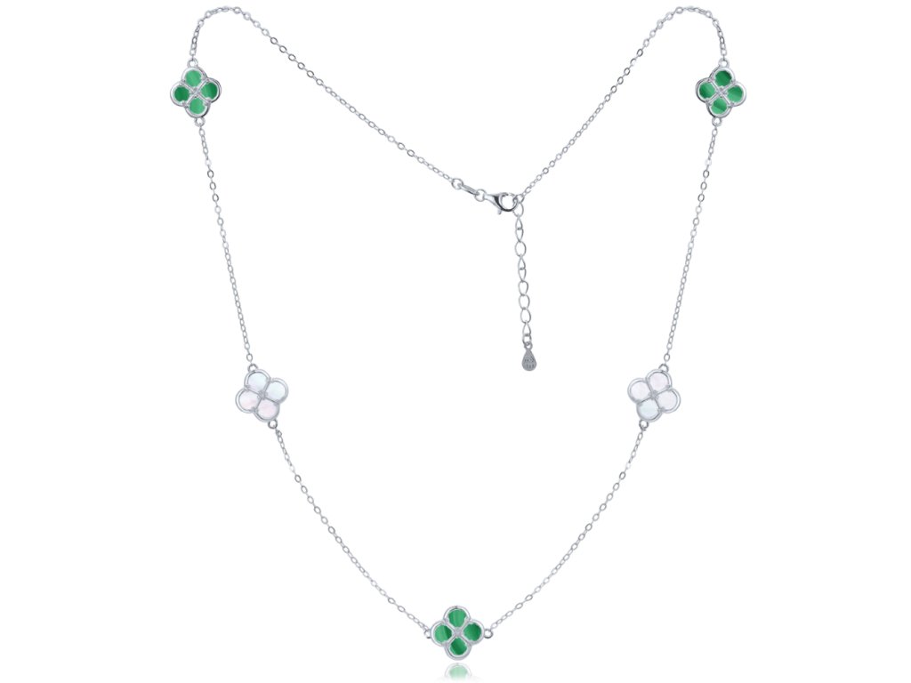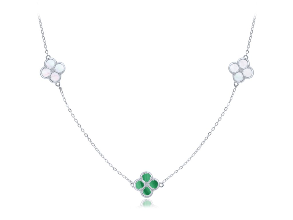 MINET Stříbrný náhrdelník čtyřlístky s bílou perletí a malachitem