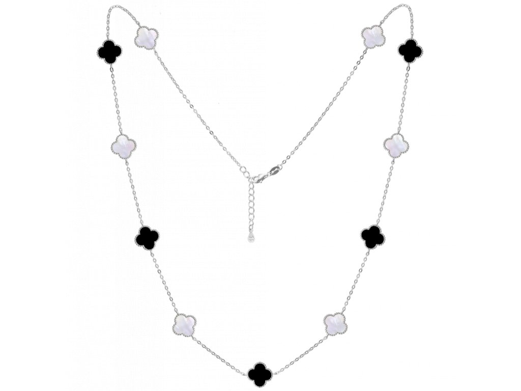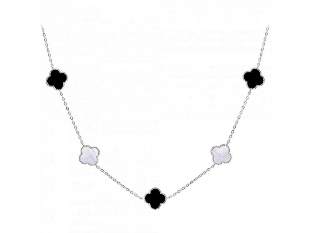 MINET Stříbrný náhrdelník čtyřlístky s bílou perletí a onyxem Ag 925/1000 11,55g