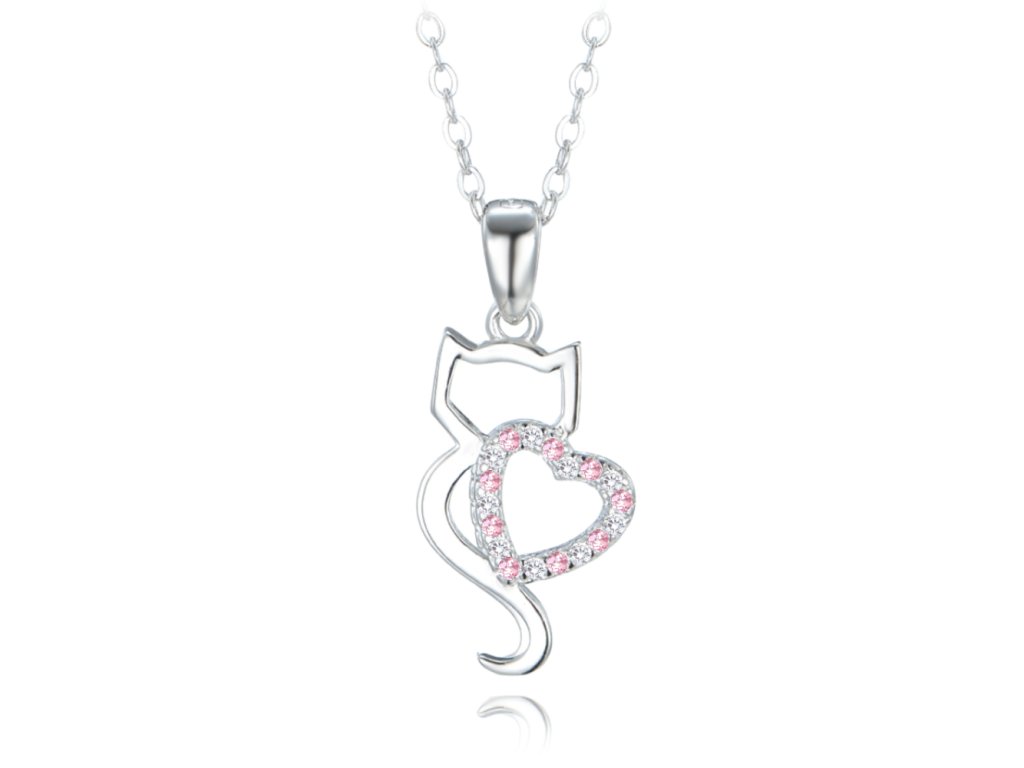 MINET Stříbrný náhrdelník kočka se srdíčkem s bílými a růžovými zirkony