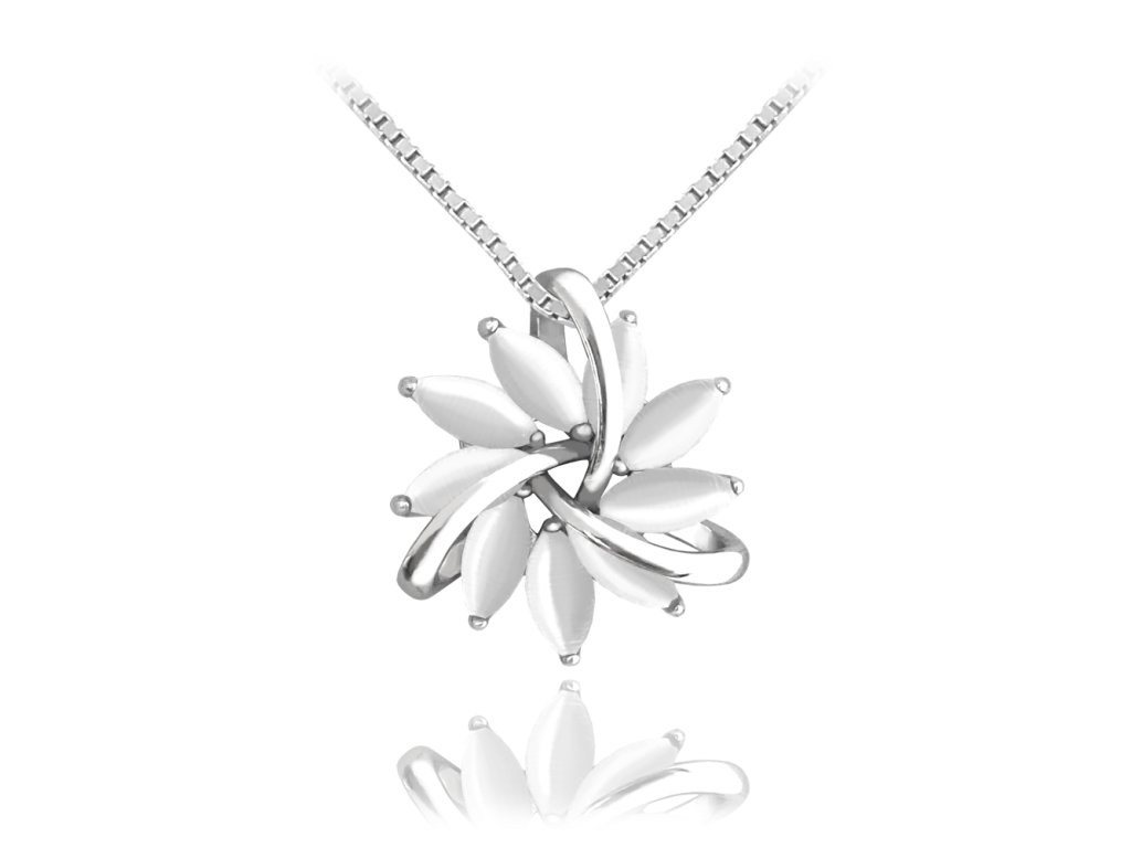 MINET Stříbrný náhrdelník kytička s bílým KOČIČÍM OKEM