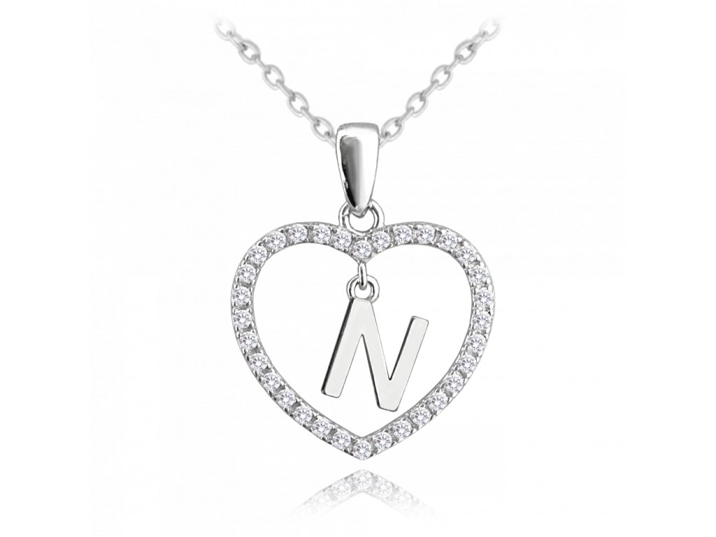 MINET Stříbrný náhrdelník písmeno v srdíčku "N" se zirkony