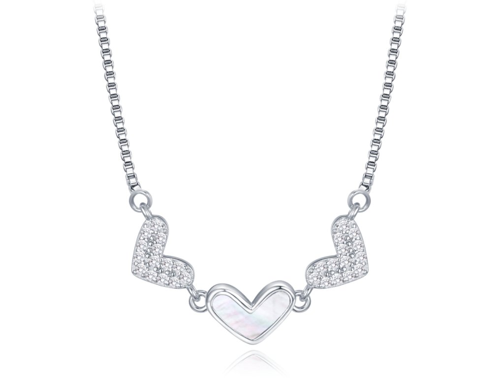 MINET Stříbrný náhrdelník srdíčka s bílými zirkony a s bílou perletí