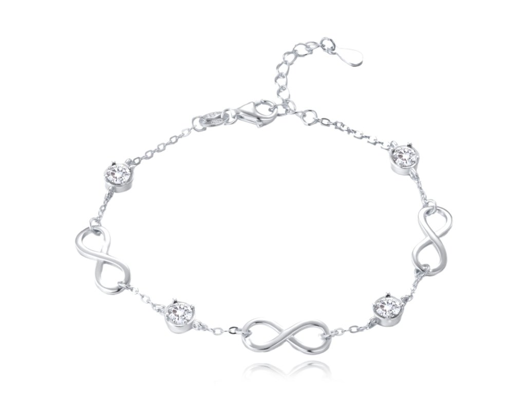 Stříbrný náramek MINET se symboly nekonečna je odrazem současných trendů. Zajímavě posazené kamínky z něj originální udělají doplněk pro každodenní nošení.