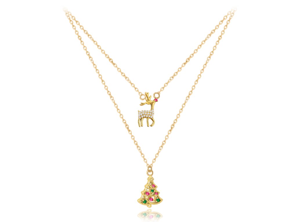 MINET Vánoční pozlacený dvojitý stříbrný náhrdelník REINDEER a CHRISTMAS TREE