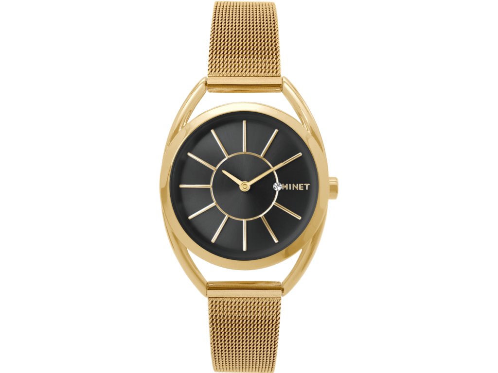 Elegantní hodinky české značky MINET s černým číselníkem a moderním ocelovým řemínkem milánského typu ve zlaté barvě. Vyměnitelný řemínek se snadným systémem zkracování se přizpůsobí obvodu ruky. Hodinky jsou vyrobeny z hypoalergenní nerezové oceli.