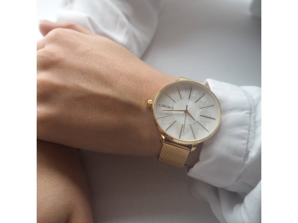 Elegantní hodinky české značky MINET s bílým perleťovým číselníkem a moderním ocelovým řemínkem milánského typu. Vyměnitelný řemínek se snadným systémem zkracování se přizpůsobí obvodu ruky. Hodinky jsou vyrobeny z hypoalergenní nerezové oceli.