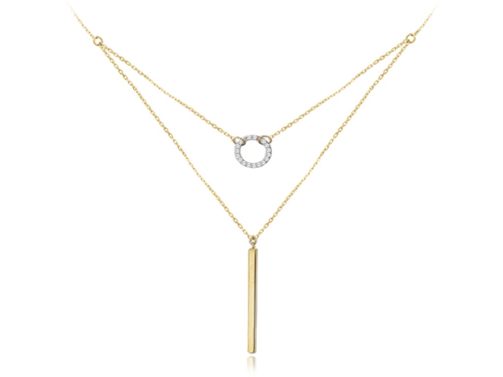 Krásný náhrdelník z pravého 14karátového zlata zdobí kroužek se třpytivými zirkony na kratší části a visící tyčka na delší části. Náhrdelník je vhodný jak pro každodenní nošení, tak pro zvláštní příležitosti. Kvalitního zpracování si všimnete hned po prvním nošení.