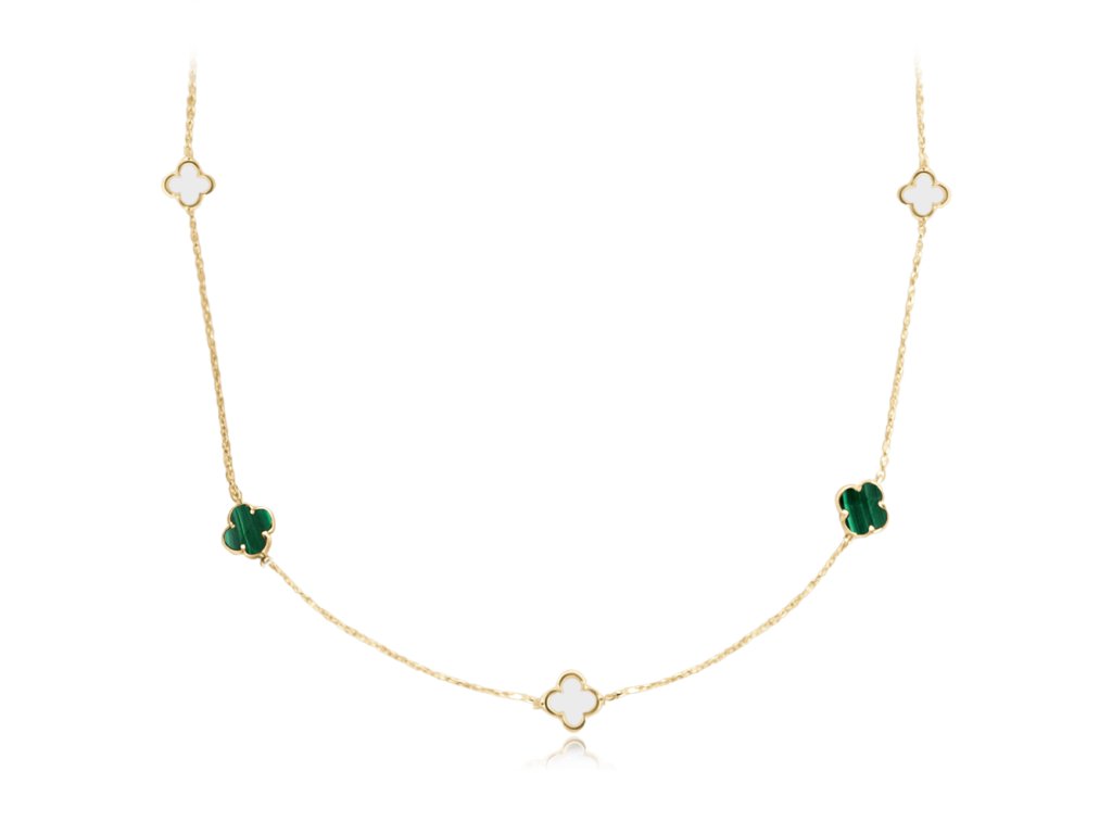 MINET Zlatý náhrdelník čtyřlístek se zeleným malachitem a bílou perletí Au 585/1000 4,20g