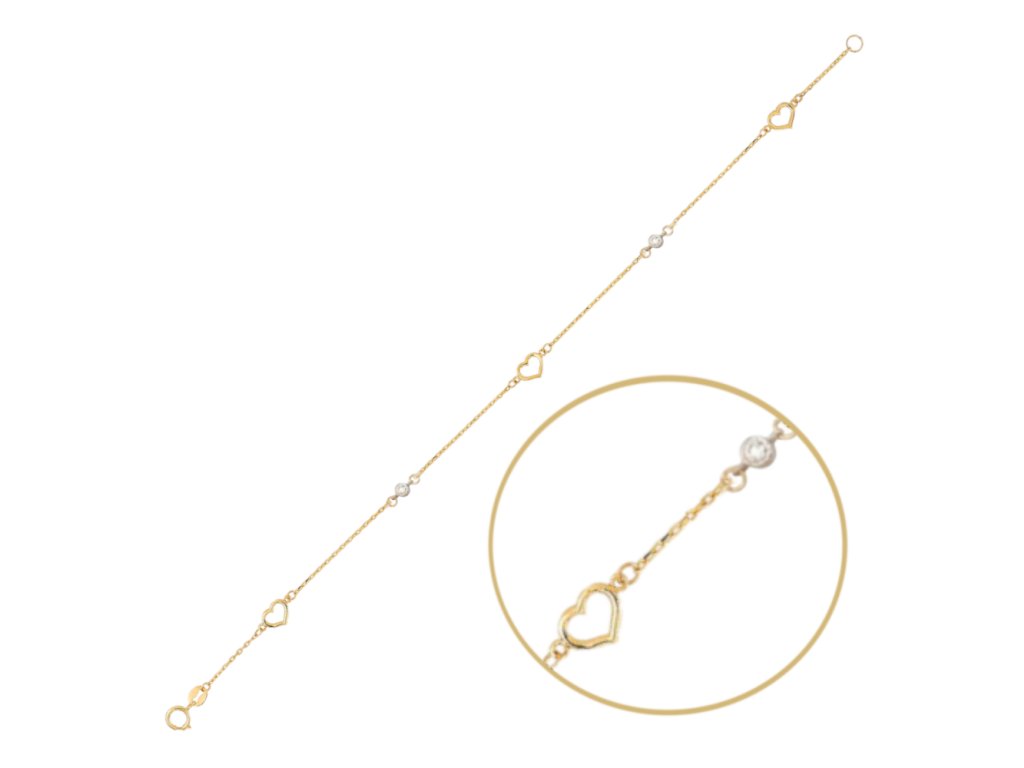 Elegantní náramek vyrobený z pravého zlata o ryzosti 585/1000. Náramek je ozdoben decentními srdíčky a bílými zirkony. Zlatý náramek je vhodným dárkem pro partnerku, maminku i přítelkyni.
