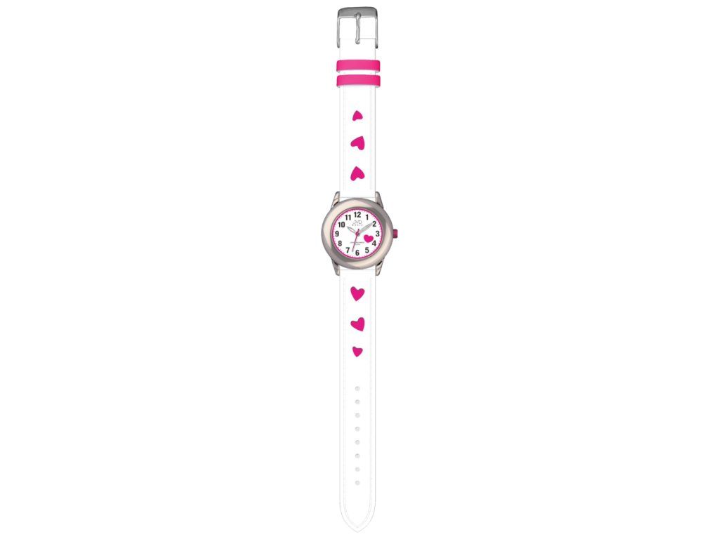 Dětské náramkové hodinky s jednoduchými motivy srdíček na řemínku a číselníku. Jistě oceníte také dobře čitelný a přehledný číselník pro snadné odezírání času.