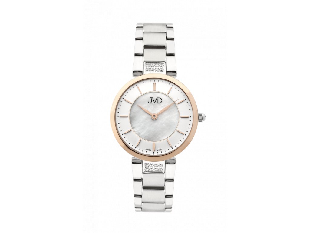 Hodinky JG1013 si Vás získají dokonale zpracovaným perleťovým ciferníkem a kovovým řemínkem zdobeným jemnými kamínky. Hodinky mají pouzdro z nerezové oceli, minerální tvrzené sklíčko a vodotěsnost 5 ATM, takže se nemusíte bát ani kontaktu s vodou. O správný chod se pak postará spolehlivý švýcarský strojek Ronda 762. Rose gold část hodinek je upravena metodou IP Rose.