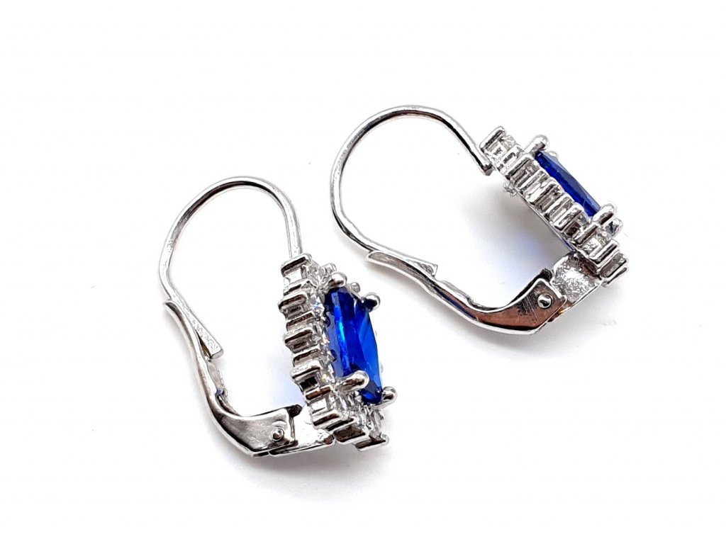 Obdelníkové tanzanitové náušnice. Zdobené zirkony po okrajích, vyrobené z rhodiovaného stříbra.