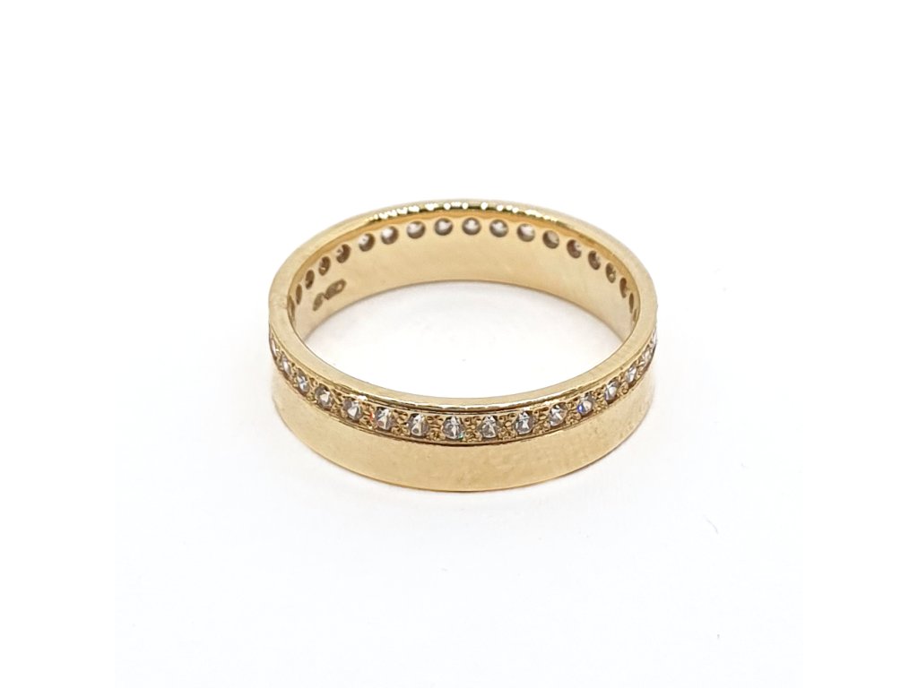 Decentní snubní prsten ze 14kt žlutého zlata, který kombinuje hladkou leštěnou plochu s jemnou linií čirých zirkonů. Moderní design a čisté linie dělají z tohoto prstenu perfektní symbol Vašeho slibu.