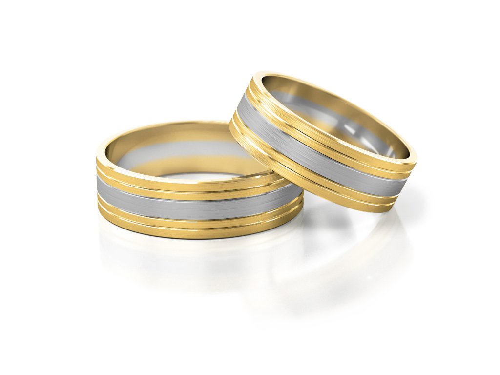 Snubní prsteny pro nevěstu a ženicha jsou ze zlata ryzosti 585/1000. Kombinace bílého a žlutého zlata doplňuje lesklé/matné provedení.