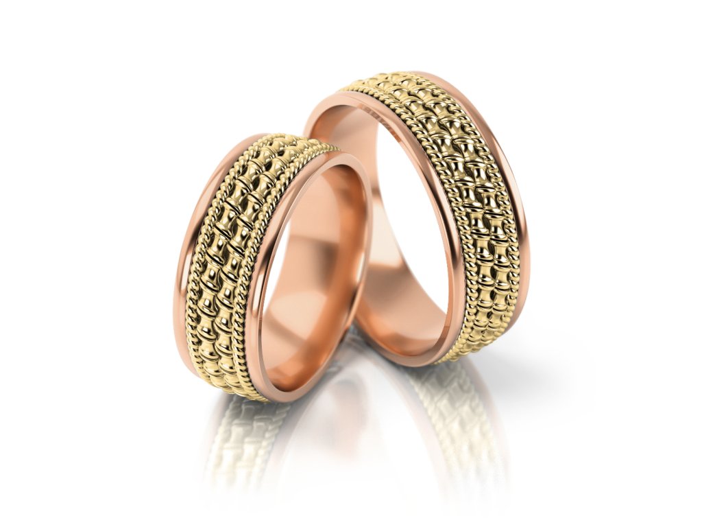 Snubní prsteny pro nevěstu a ženicha jsou z kombinace zlata ryzosti 585/1000 a doplňuje je lesklé provedení.