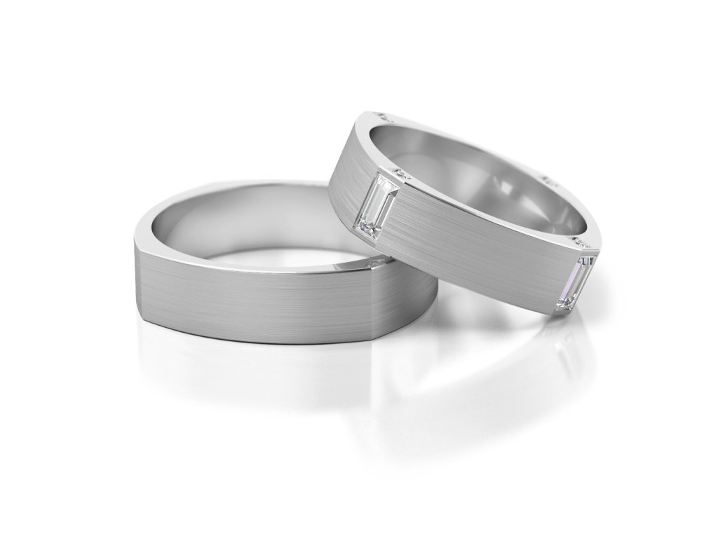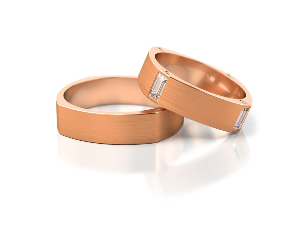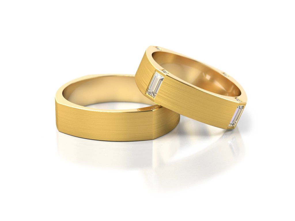 Snubní prsteny pro nevěstu a ženicha jsou ze zlata ryzosti 585/1000. Prsten ze žlutého zlata doplňuje matné provedení. Dámský prstýnek je rozzářen kamínky.