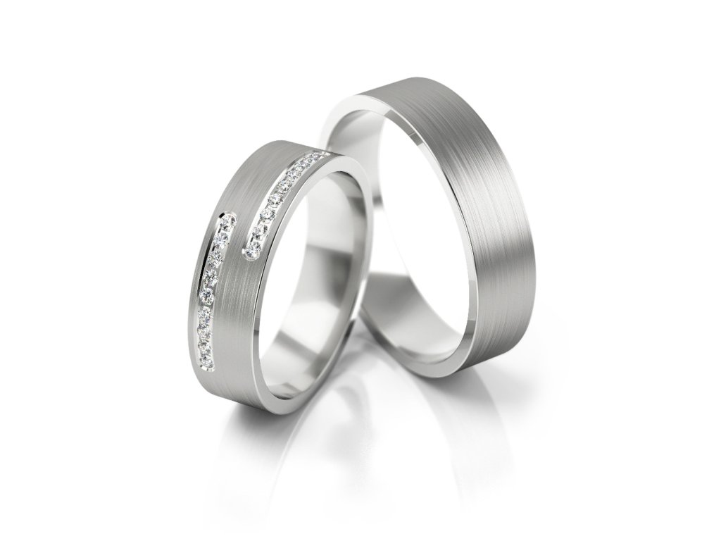 Snubní prsteny pro nevěstu a ženicha jsou ze zlata ryzosti 585/1000. Prsten z bílého zlata doplňuje matné provedení. Dámský prstýnek je rozzářen kamínky ve středu kroužku.