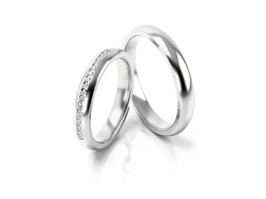 Snubní prsteny pro nevěstu a ženicha jsou ze zlata ryzosti 585/1000. Prsten z bílého zlata doplňuje lesklé provedení. Dámský prstýnek je rozzářen kamínky.