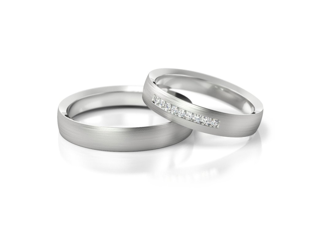 Snubní prsteny pro nevěstu a ženicha jsou ze zlata ryzosti 585/1000. Prsten z bílého zlata doplňuje matné provedení. Dámský prstýnek je rozzářen kamínky.