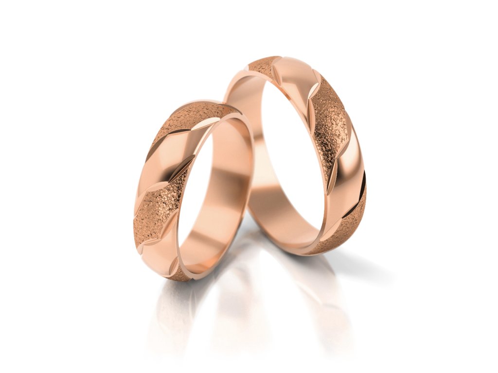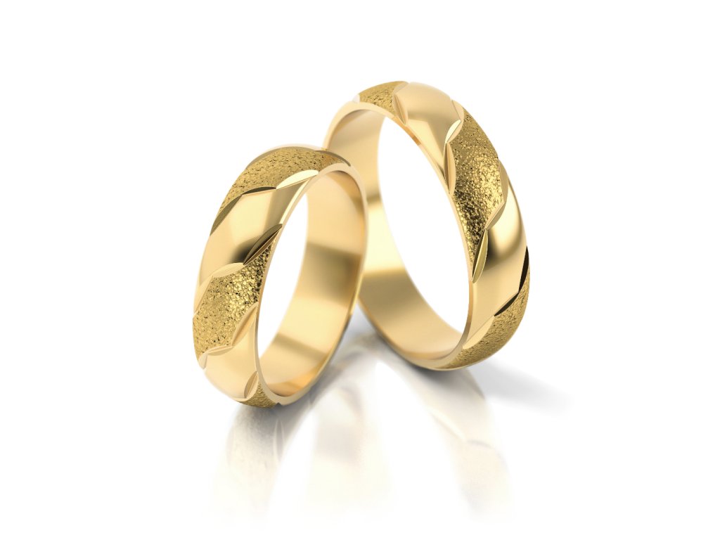 Snubní prsteny pro nevěstu a ženicha jsou ze žlutého zlata ryzosti 585/1000. Doplňuje matno-lesklé provedení.